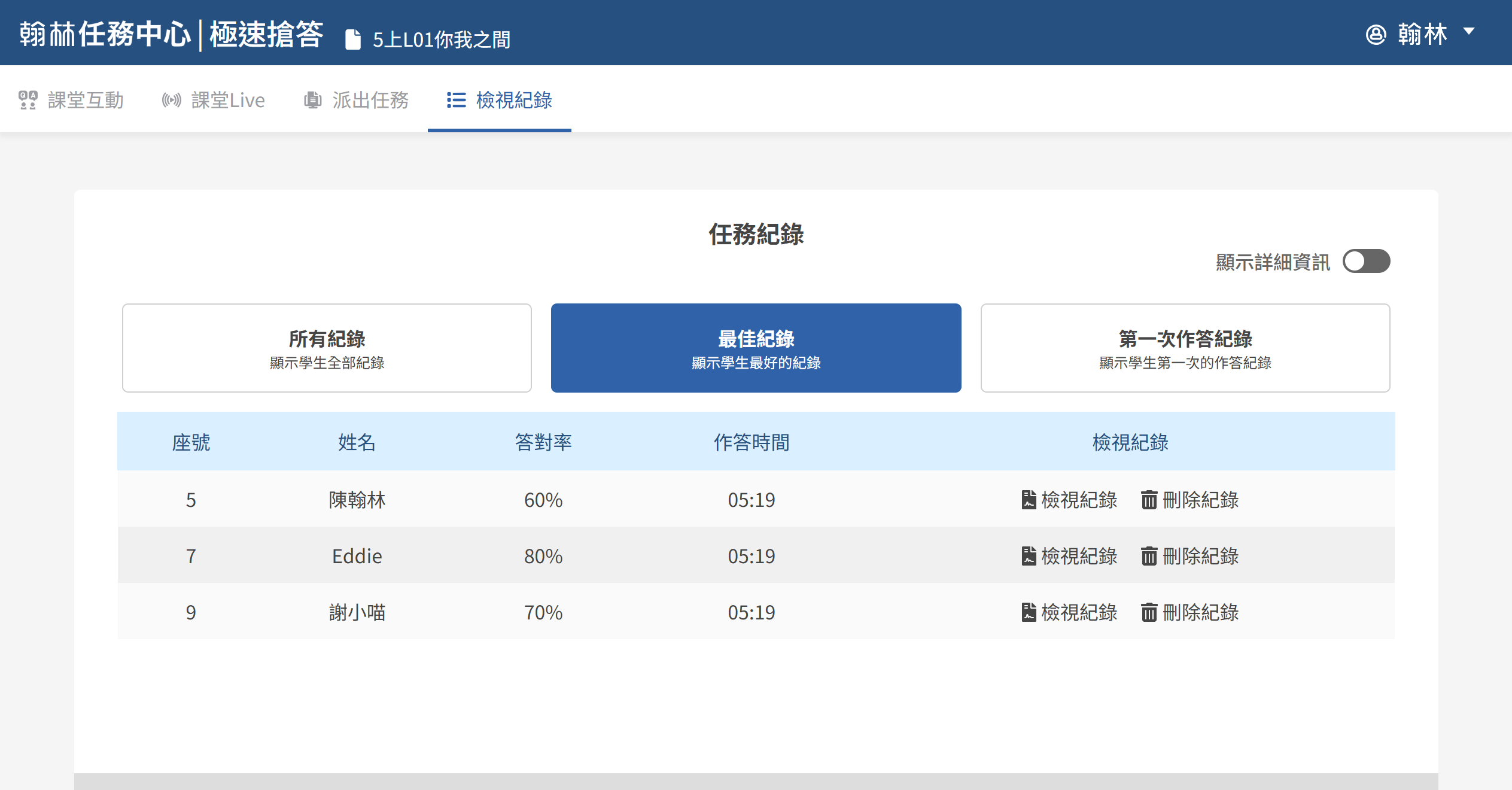 答題紀錄直通「任務中心」,整學期教學歷程不遺漏,成績管理好輕鬆。